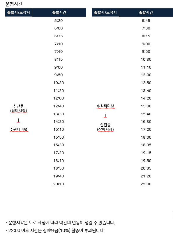 | 수원공용버스터미널 | 06:40 | 22:00 |